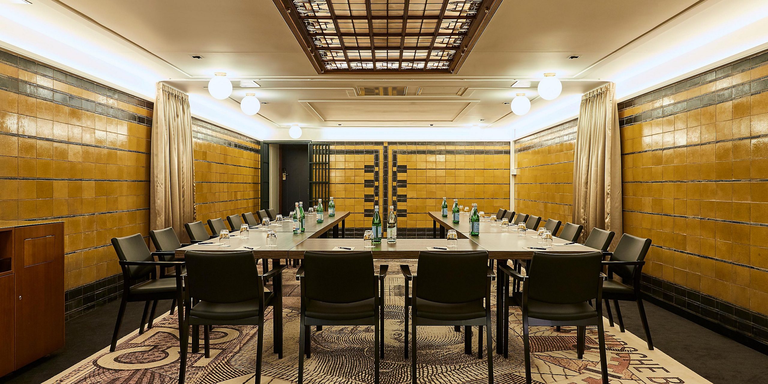 Retaining as many authentic finishes as possible, such as the terrazzo floor and the striking yellow/black tiling, The Vault truly captures the essence of the banking heritage. To further enhance the atmosphere, the room features a custom-designed carpet adorned with images of coins and banknotes, depicting the rich history of the Dutch guilder.